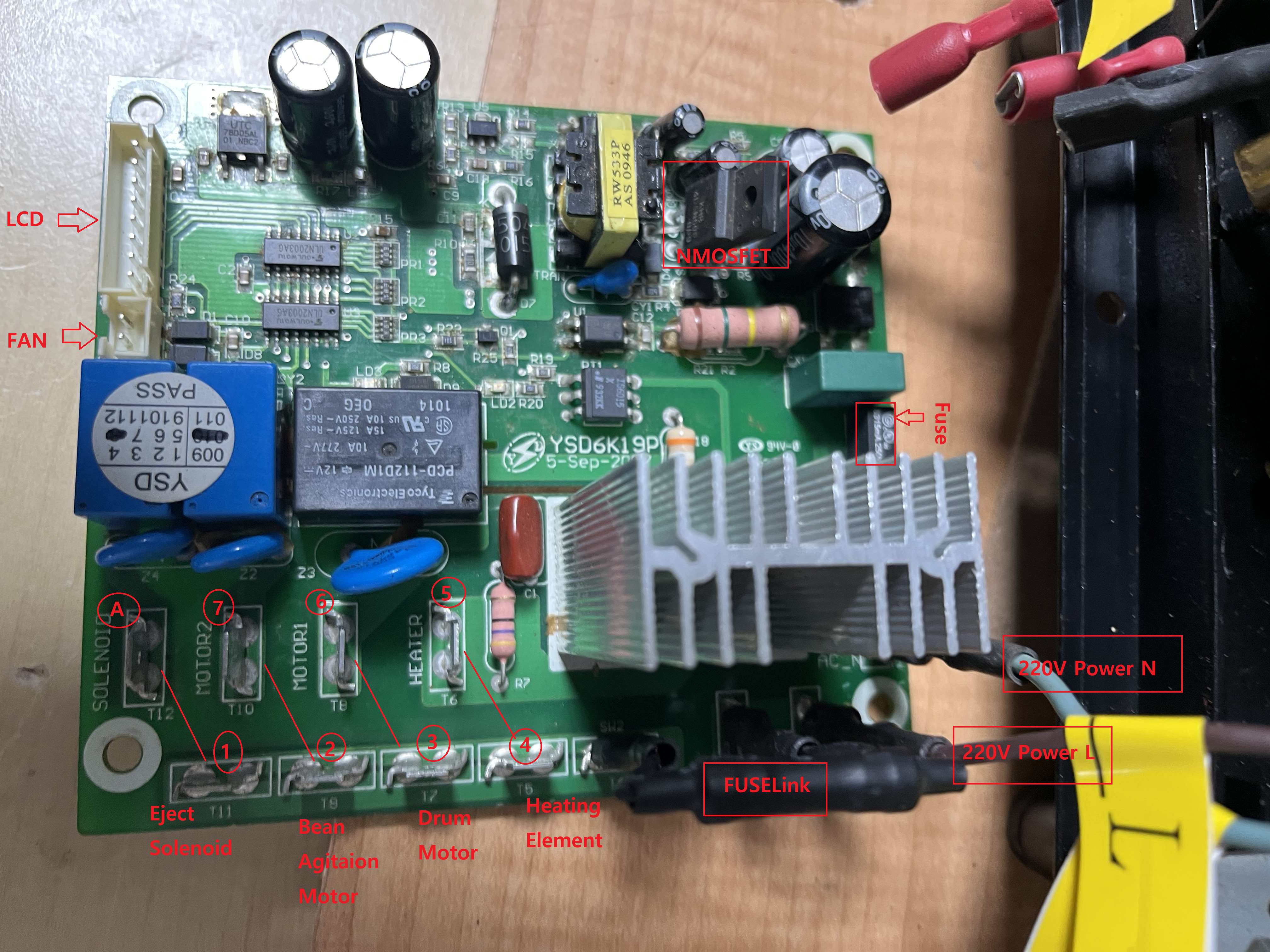 위 사진에서 Fuse부품을 확인하고 보드에서 퓨즈가 어디에 있는지 확인해 본다. Fuse는 쉽게 교체가 어렵게 되어 있다. 기판에서 납땜으로 제거 하고 새로 납땜을 해야한다. 테스터로 퓨즈가 단선되었는지 확인하고 부품을 교체하여야 한다. 부품은 인터넷에서 구매할 수 있다. 또한 FuseLink를 확인해 본다. 과열이 심하면 이 부품도 손상이 있을 수 있다. 도통체크만 하면 되며 이 부품은 쉽게 교체가 가능하다. NMOSFET (KHB 4D5N60F)도 손상이 있을 수 있다. 퓨즈 교체로 문제가 해결이 안된다면 이 부품도 의심해 보자. 대부분 이 정도 이면 수리를 완료할 수 있다. 작업하기 전에 보드에 연결된 선의 연결해제를 해야하는 데 다음 조립을 위해 번호를 붙여주고 작업을 하면 좋을 듯 싶다.