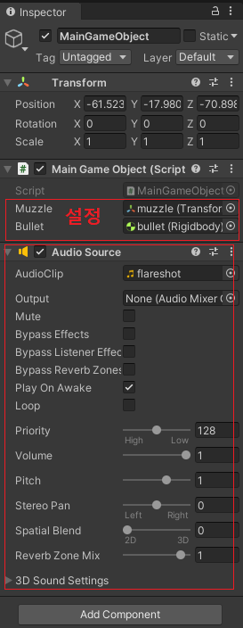MainGameObject 객체에 AudioSource 컴포넌트를 추가하고 AudioClip에 총소리 wave를 설정하자.