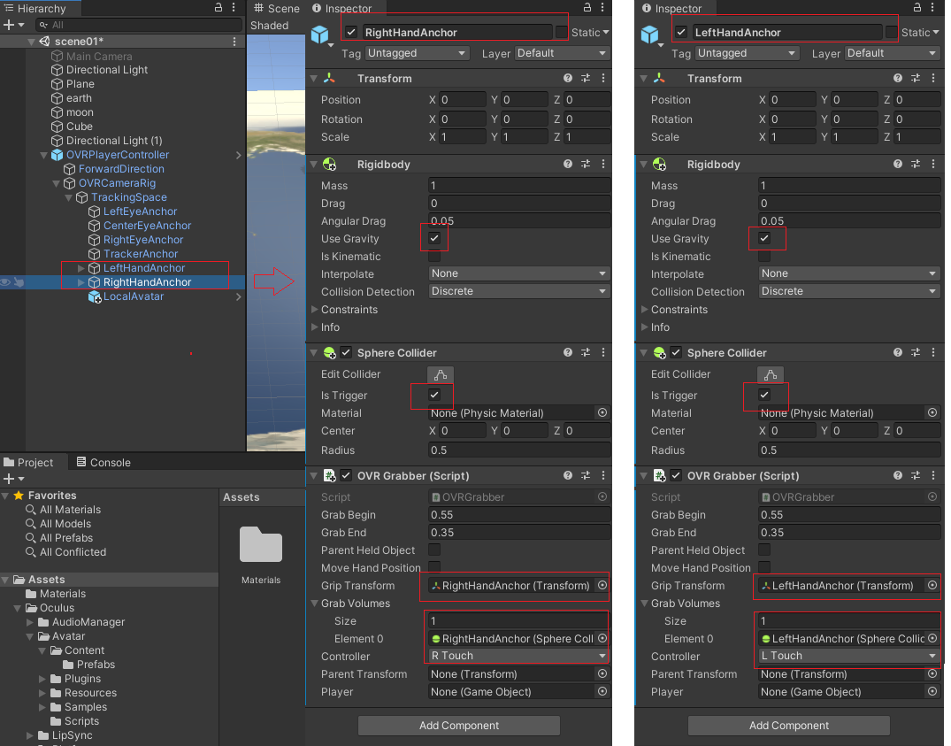 LeftHandAnchor와 RightHandAnchor에 각각 Rigidbody, Sphere Collider 및 OverGrabber(스크립트)를 추가한다.