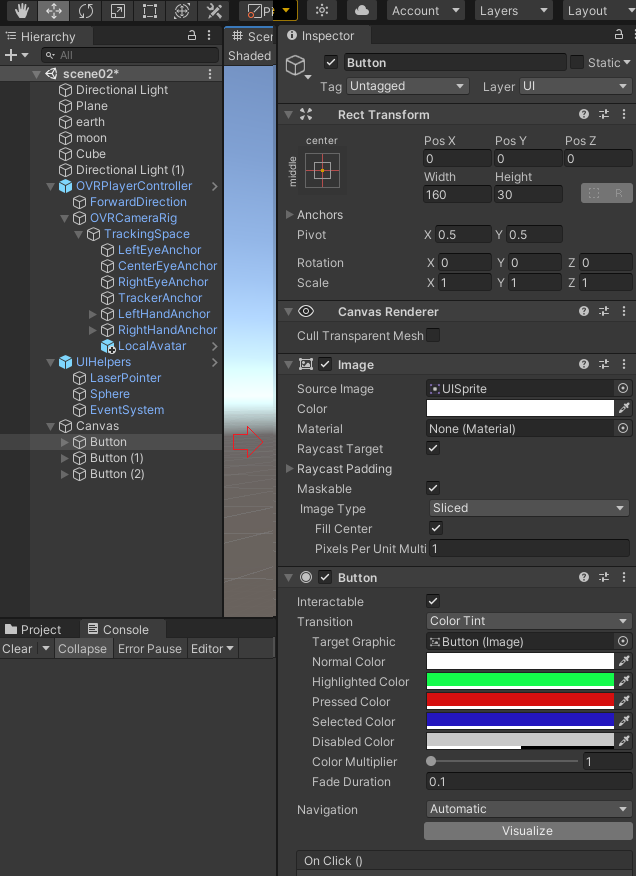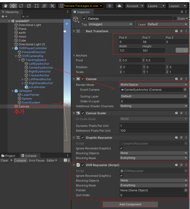 Cavas를 추가한다. 이름을 CanvasConsole이라고 변경하였다. 그 자식으로 Text (UI)를 추가하였다. Canvas의 Render Mode는 Screen Space -Camera로 설정하였다. RenderCamera는 CenterEyeAnchor로 설정하였다. Text UI는 가로세로 크기 조정과 위치를 수정한다.