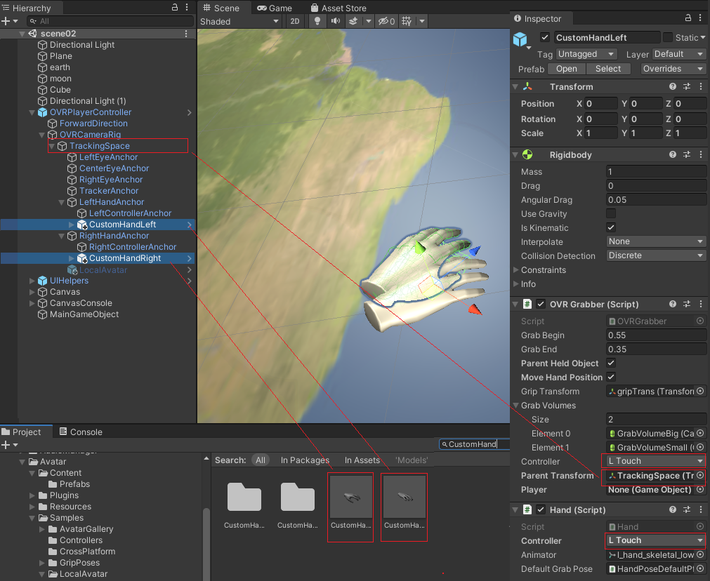 CustomHandLeft/CustomHandRight에는 Inspector창에서 Parent Transform에 TrackingSpace 를 설정한다. 왼쪽 손에는 L Touch를 오른손에는 R Touch를 설치한다. OverGrabber이 설치되어 있으므로 물건을 잡을 수 있다. CustomHand를 이용하여 물건을 잡을 수 있다. 테스트를 하여본다.