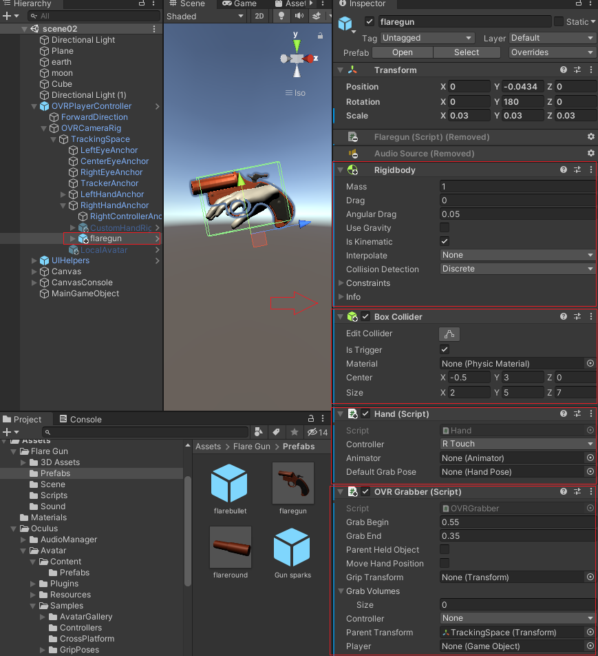 제공하는 CustomHand 대신에 다른 메쉬를 사용하여 보자. 예를 들어 권총 등의 매쉬를 컨트롤러 대신에 사용할 수 있다. CustomHandRight을 비활성화하고 적절한 모델을 구하여 설치하여 보자. 여기서는 Gun을 설치한다. Gun에는 Rigidbody, BoxCollider, Hand(Script), OVRGrabber(Script)를 설치한다. 즉 다양한 3D모델을 컨트롤러 모습 대신으로 사용할 수 있다. 또는 제공하는 핸드와 모델 Gun을 동시에 보여줄 수 있는 방법으로 제작할 수도 있다. (핸드의 위치와 애니메이션과 어울리도록 하는 작업이 어려움)