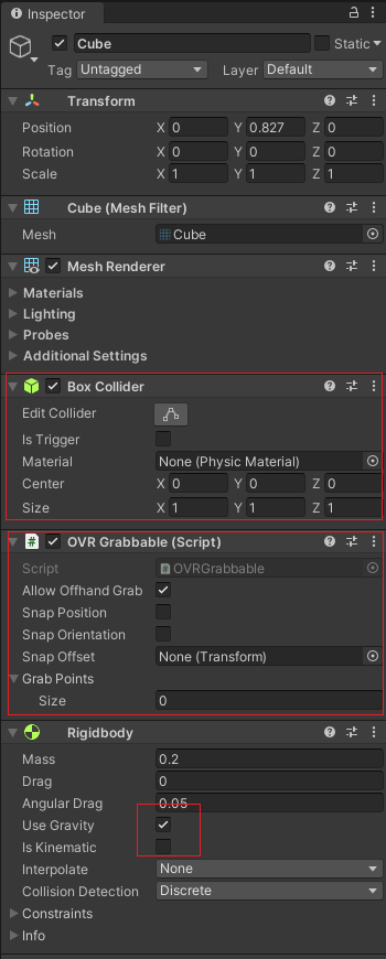 바닥의 평면에는 mesh collider를 설치한다. 2개의 구에는 각각 Sphere Collider와 Rigidbody를 설치한다. Box 6면체에도 Box Collider와 Rigidbody를 설치한다. 모두 gravity를 채크하여 중력의 영향을 받도록 하자. 이들 3개의 객체가 컨트롤러에 의해 Grab이 되기 위해서는 OvrGrabbale 스크립트(Integration Package) 컴포넌트를 붙여준다.