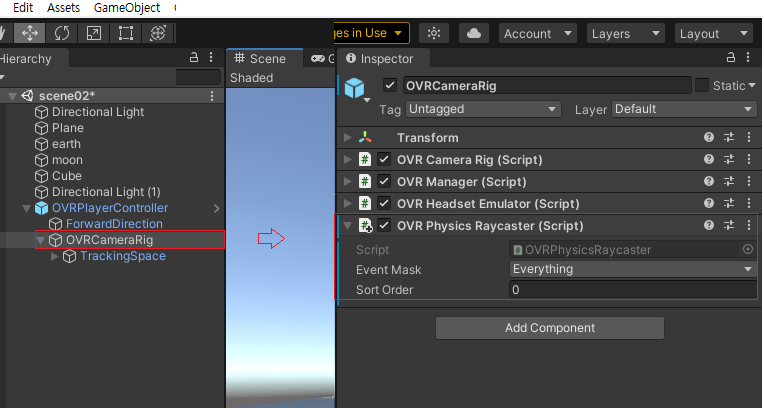 OVRCameraRig에 OVRPhysicsRaycaster 스크립트를 붙여준다.