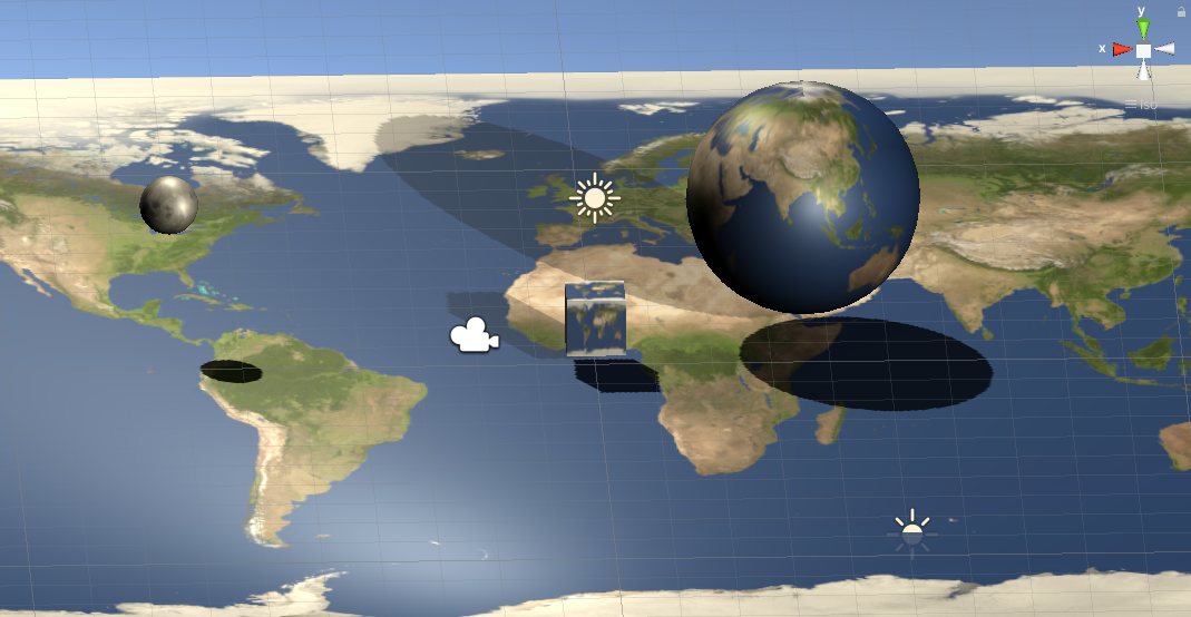 Scene에 평면을 만들고 2개의 구와 1개의 6면체를 아래와 같이 만든다.