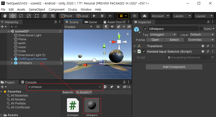 UIHelper > EventSystem 에 OVRInputModule 스크립트 추가하고 Ray Transform대상을 RightHandAnchor로 설정하여 준다.