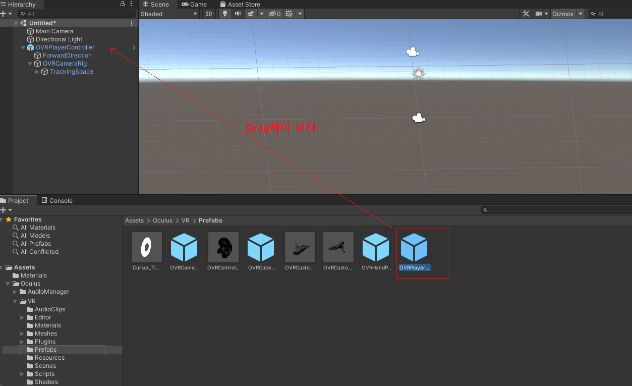 Main Camera를 삭제하거나 비활성화를 하고 OvrPlayerController 프리팹을 Scene에 배치한다.